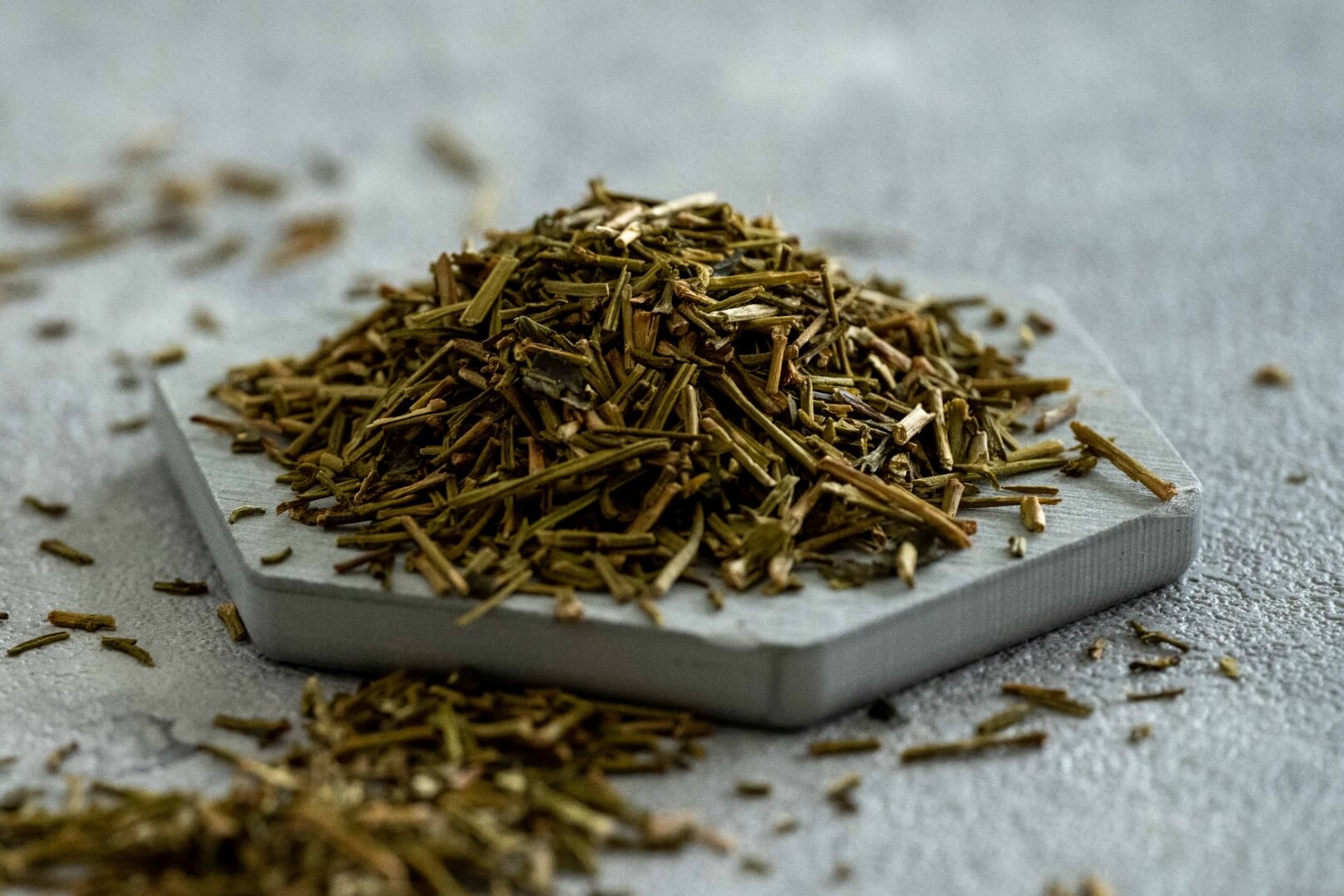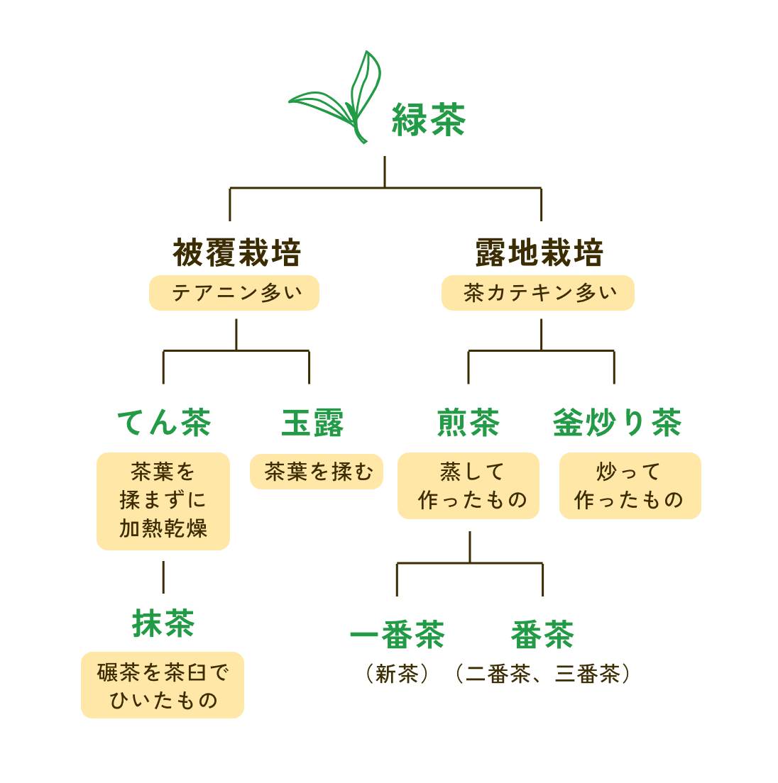 茶の木に覆いをかぶせ太陽の光を遮って栽培した茶葉を蒸し、揉まずに乾燥させたお茶をてん茶と呼びます。希少価値が高く、てん茶を石臼などで挽いたものが抹茶となります。遮光することで新芽が成長しても柔らかく、独特の香味や適度な渋みがありながら甘みや旨味を引き出します。手もみされていないため雑味も少なく、純粋なお茶の味わいを感じられます。